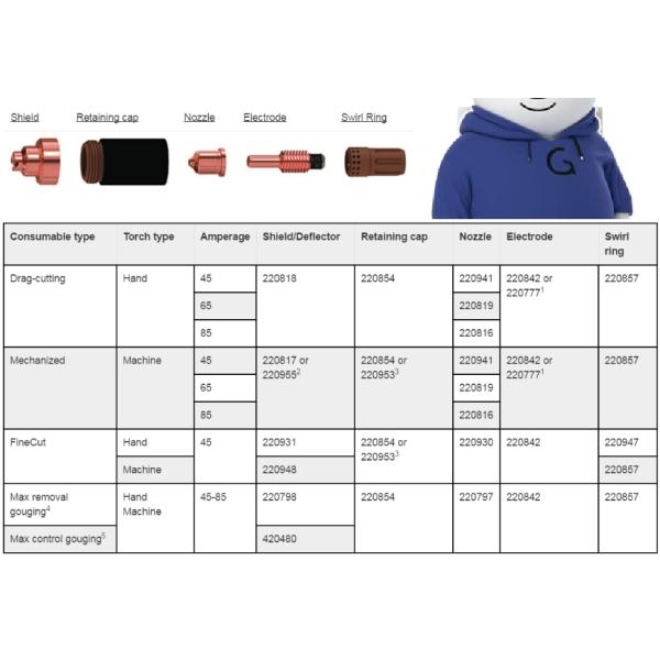 Nozzle Spares 220816, 220990, 220819, 220941, 220930 for 45 -105A Plasma Cutting Consumables